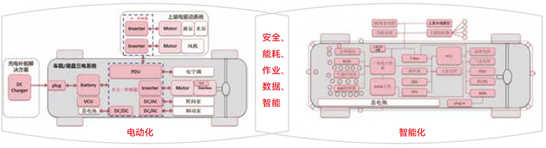 通過底盤與上裝的一體化設計,中控屏集成了車輛駕駛、上裝作業和多媒體娛樂等多功效,實現了“一屏多用”,簡化了架構,淘汰了60%的部件和線束,從而提高了性價比和可靠性